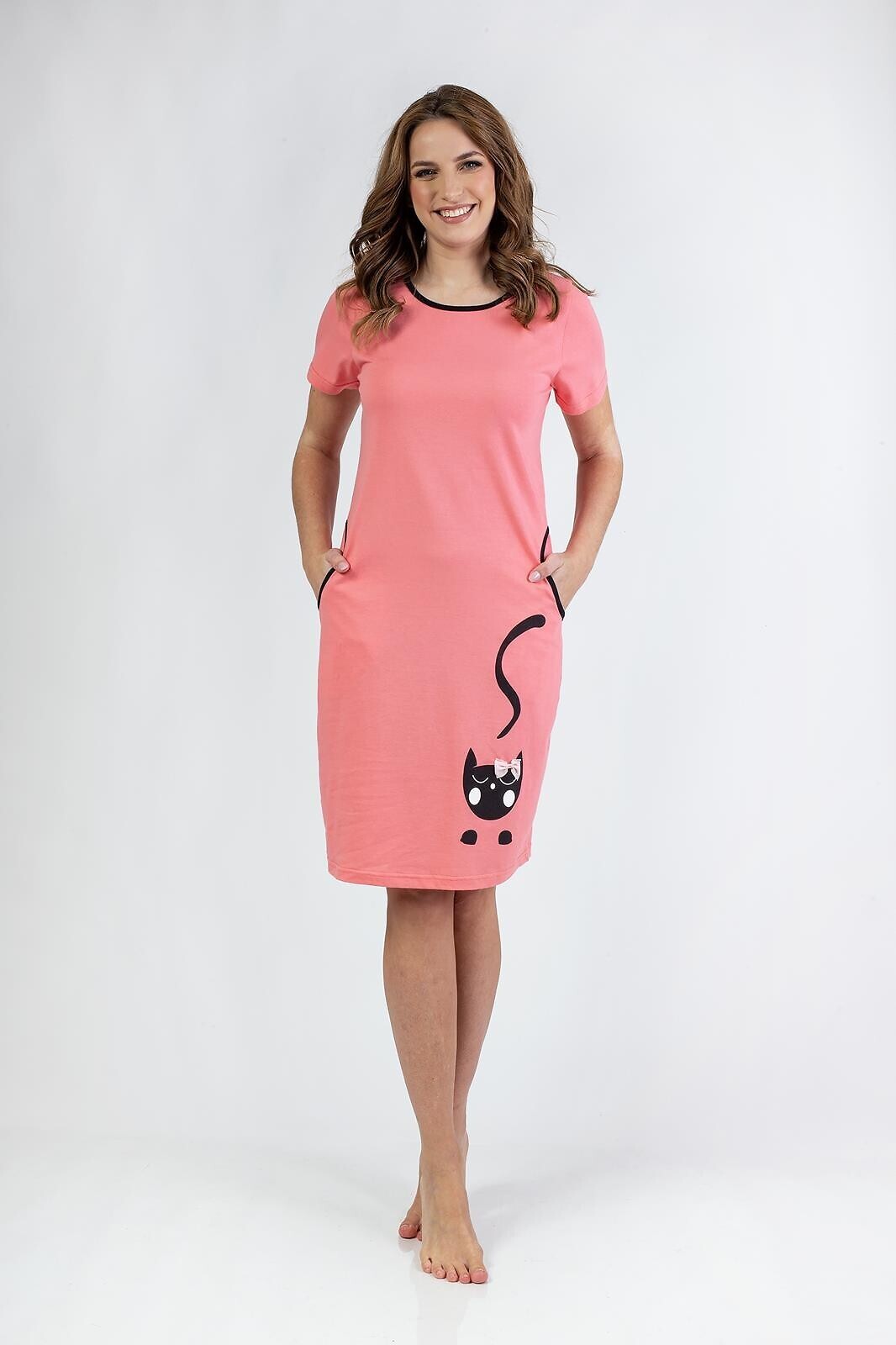 Bawełniana koszula damska- krótki rękaw- dekolt półokrągły- efektowny print z kotem- na biodrach wygodne kieszenie- długość przed kolano číst celé