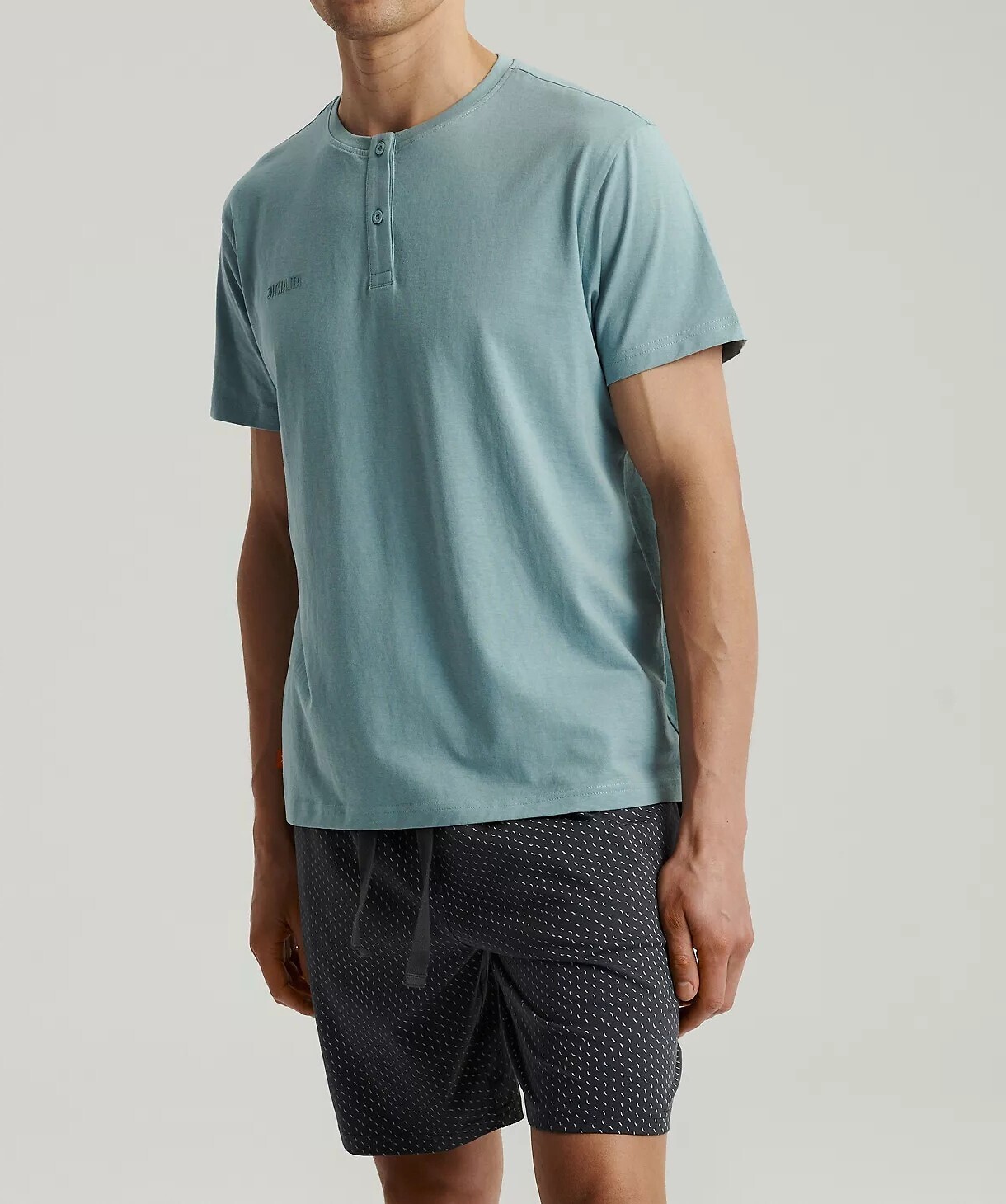Letnia piżama męska- miękka dzianina z bawełny- koszulka z krótkim rękawem- okrągły dekolt z rozcięciem i dwoma guzikami- luźne, krótkie spodenki ozdobione drobnym wzorem- w pasie guma obszyta dzianiną i wiązany troczek do regulacji obwodu pasa- na biodrach wygodne kieszenie číst celé