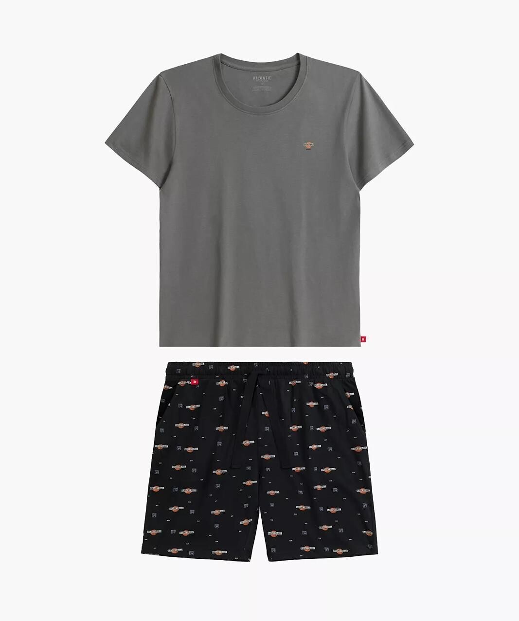 Piżama męska- wysokiej jakości dzianiny- koszulka z krótkim rękawem- okrągły dekolt- z przodu mały nadruk- krótkie, luźne spodenki- po bokach wygodne kieszenie- w pasie sznurek do regulacji obwodu pasa
