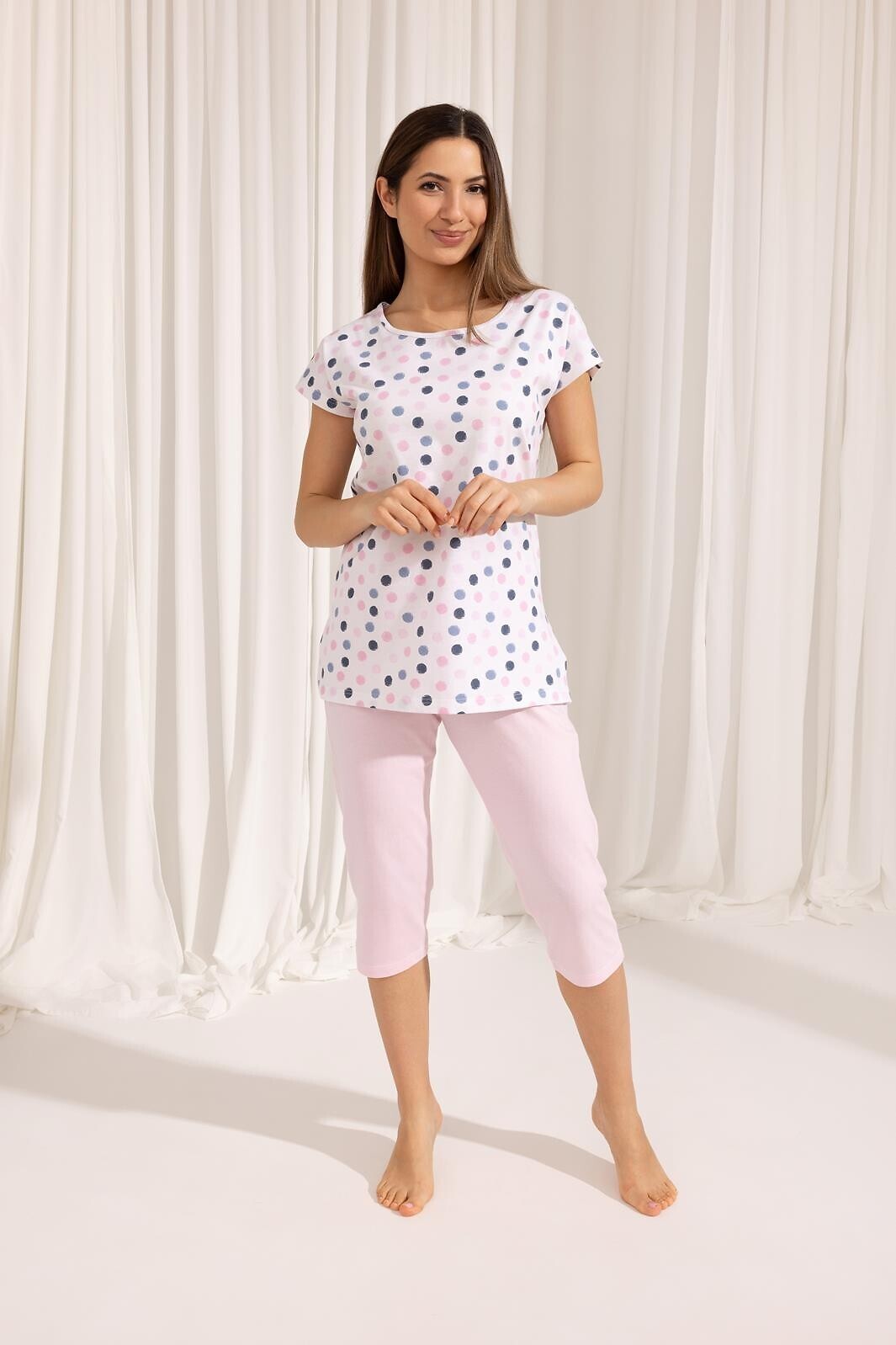 Piżama damska- wysokiej jakości bawełna- dłuższa koszulka w groszki- krótki rękaw- dekolt okrągły- u dołu rozcięcia- spodnie jednolite, typu rybaczki- w pasie gumka obszyta bawełną číst celé