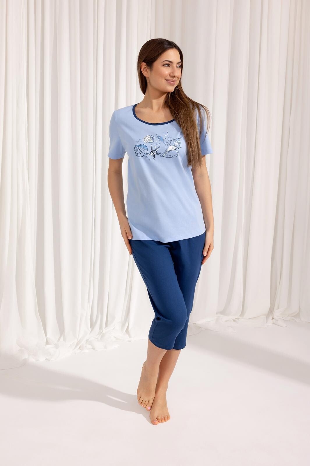 Piżama damska- wysokiej jakości bawełna- koszulka z krótkim rękawem- dekolt półokrągły- na wysokości piersi kolorowa grafika- jednolite spodnie typu rybaczki- w pasie gumka obszyta bawełną