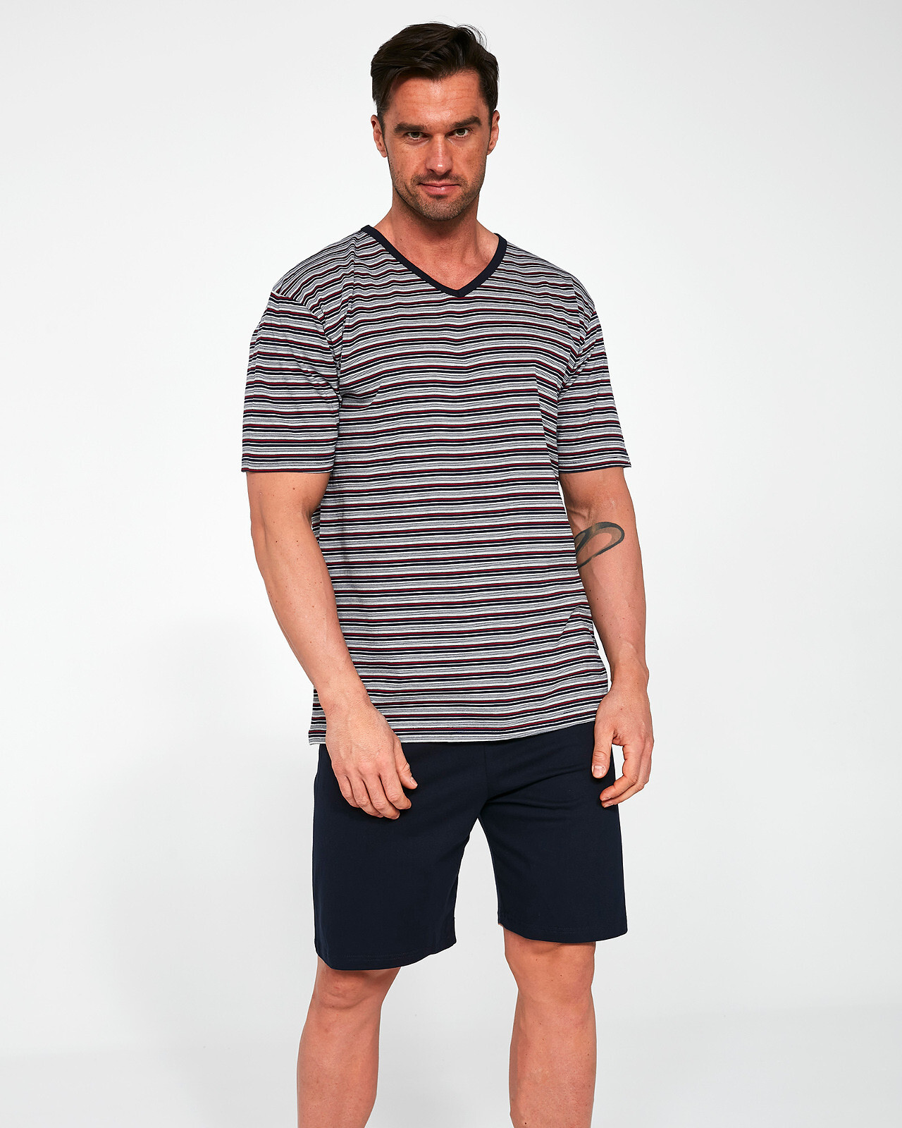 Piżama męska- z wysokiej jakości bawełny- koszulka w paski z krótkim rękawem- dekolt w szpic- do kompletu jednolite, krótkie spodenki