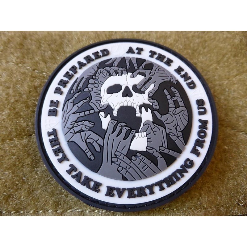 Plastová 3D kulatá nášivka, na které je nápis BE PREPARED AT THE END, THEY TAKE EVERYTHING FROM US. Průměr nášivky je cca 60 mm. číst celé