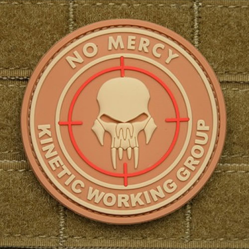 Plastová nášivka s motivem"No Mercy - Kinetic Working Group". Průměr cca 6 cm, na rubu se suchým zipem. číst celé