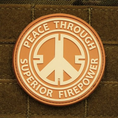 Plastová nášivka s motivem"Peace through superior firepower". Průměr cca 6 cm, na rubu se suchým zipem. číst celé