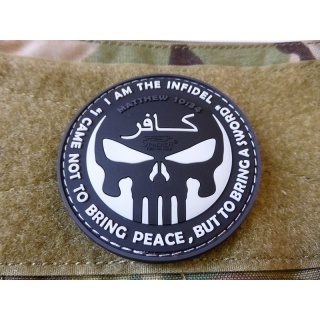 Plastová 3D velcro nášivka s nápisem I AM THE INFIDEL. "I CAME NOT TO BRING PEACE, BUT TO BRING A SWORD", uprostřed s katem. Průměr nášivky cca 65 mm- číst celé