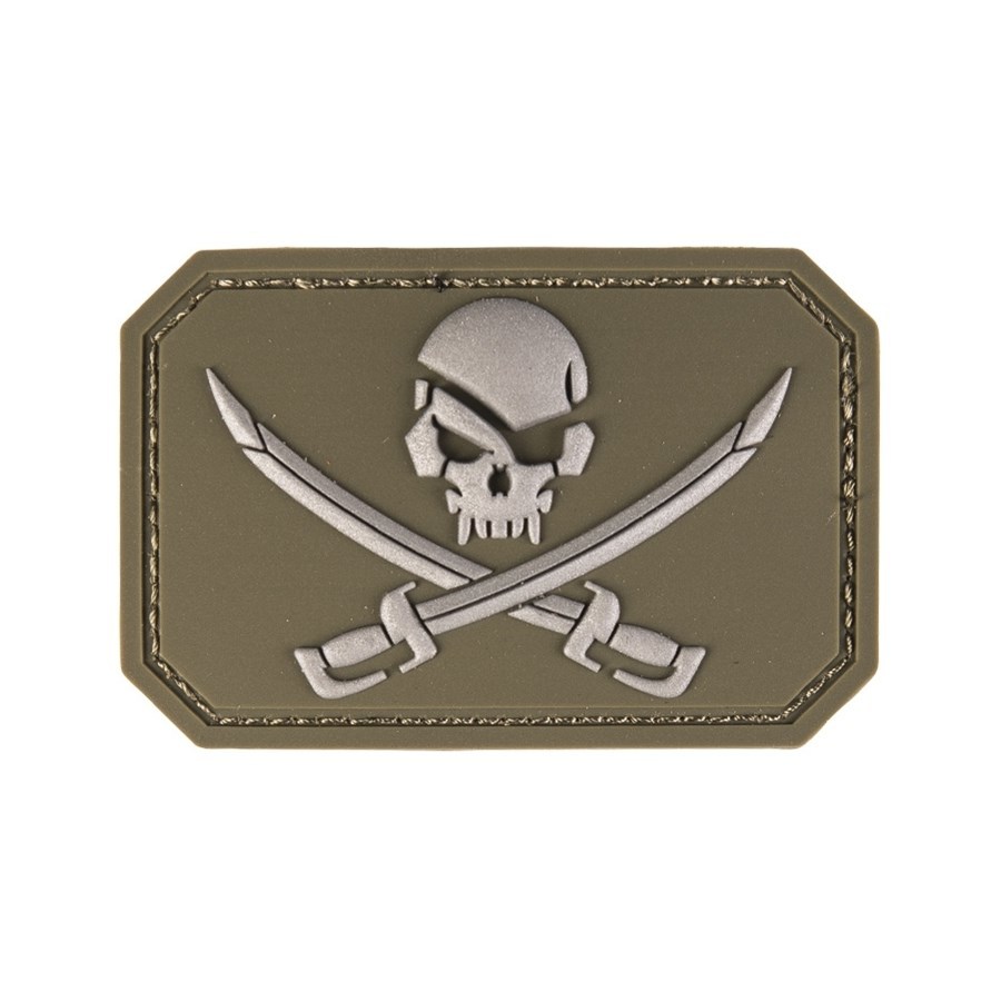 Nášivka se suchým zipem, vyrobená z kvalitního plastu. Pružná a odolná, snadná údržba. 3D provedení, lebka s páskou přes oko, pod ní zkřížené šavle. Pro oblečení (čepice, bundy, trika,..) a výstroj se suchým zipem.