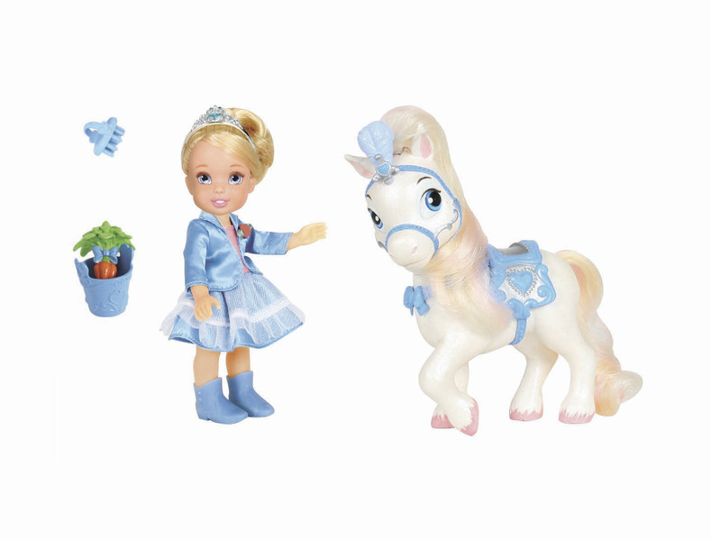 15 cm vysoká panenka se svým koněm a doplňky podle předlohy z pohádek od Disney.Balení obsahuje koně, panenku s korunkou a botami oblečenou do barevně sladěných šatů. Dále také kartáč a doplňky pro koně - kbelík a mrkev.