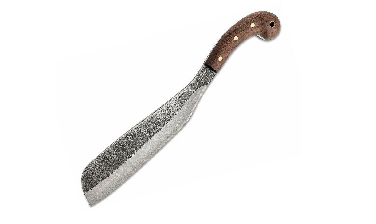 Má pevnú, ručne tepanú čepeľ s hladkou hranou z uhlíkovej ocele 1075, prechádza celým nožom (full-tang). Rukoväť je vyrobená z tvrdého dreva, zahnutý koniec rukoväte zaisťuje bezpečné uchopenie aj pri ráznom sekaní.