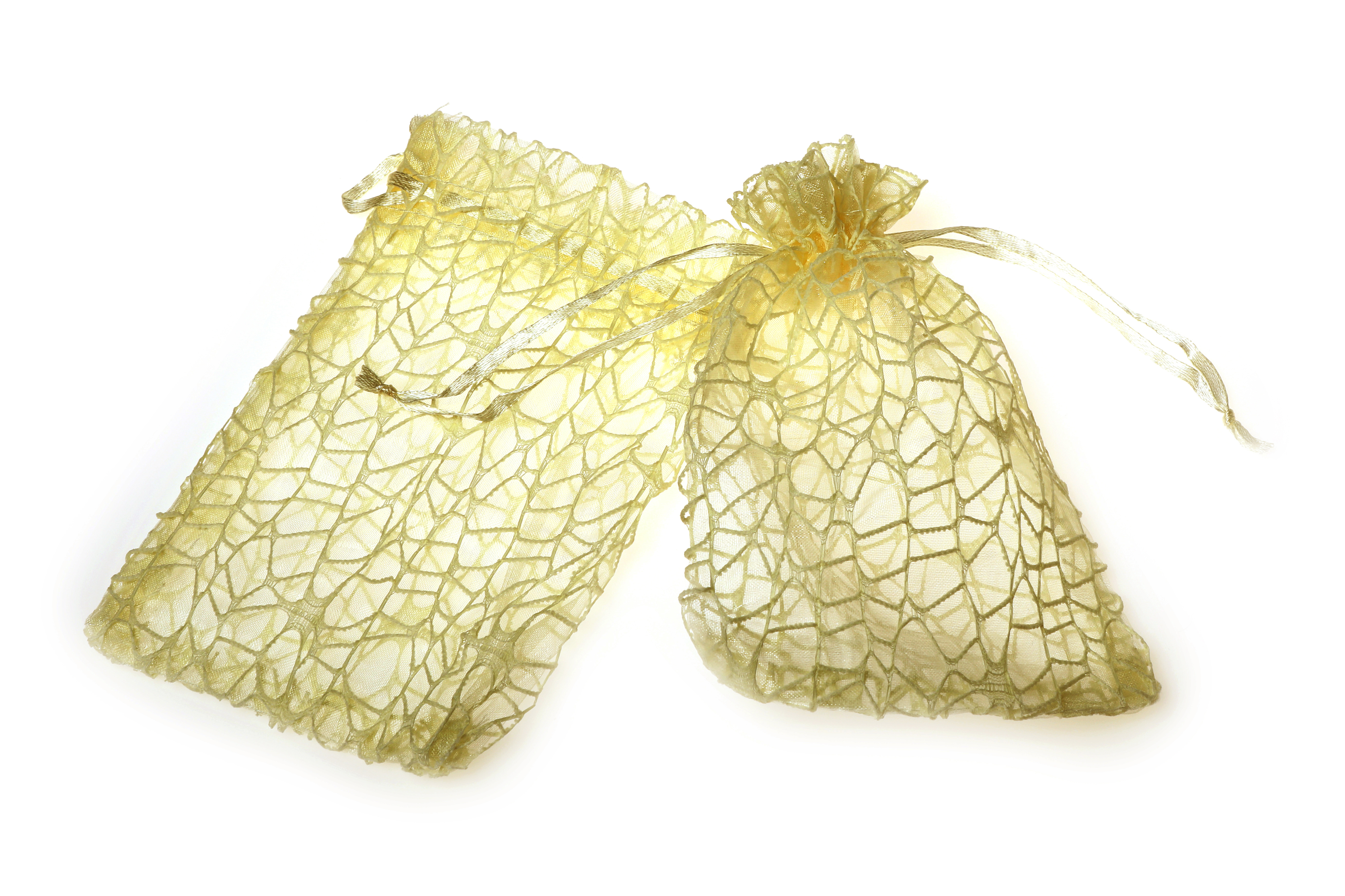Big spiderový pytlíček šampaňské barvy podšitý stejně barevnou organzou. Svatební doplněk, vhodný k naplnění svatebními madlemi, sladkostmi, mýdlíčky a jinými drobnostmi, jako poděkování vašim svatebním hostům.