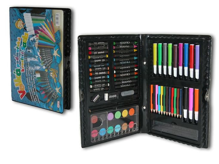 Součástí je široká škála tužek, pastelek, fixů a dalších výtvarných nástrojů.