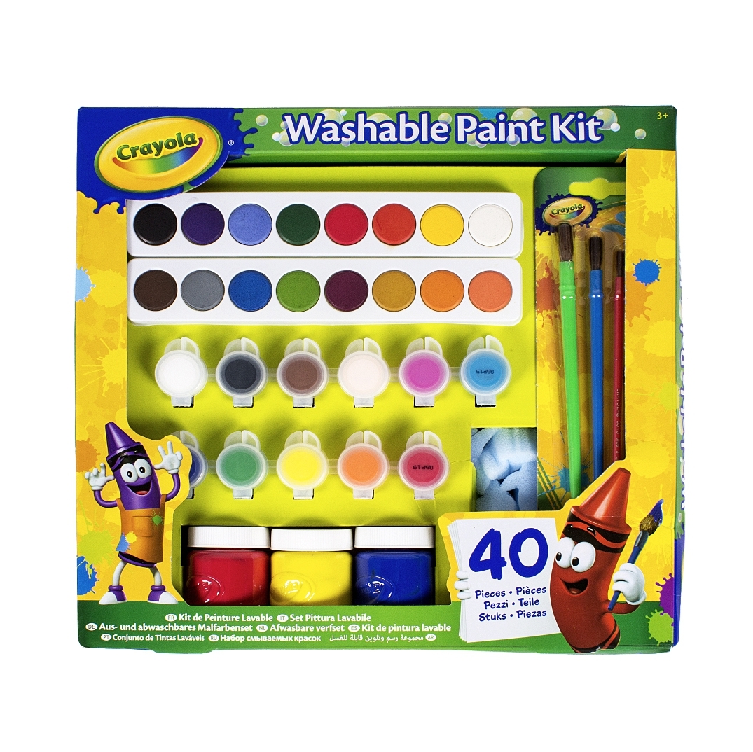 Crayola umělecká sada obsahuje 16 vodových barev, 3 prstové barvy pro nejmenší, 12 temperových barev, papíry, houbičky a štětce. Vše vodou snadno omyvatelné.
