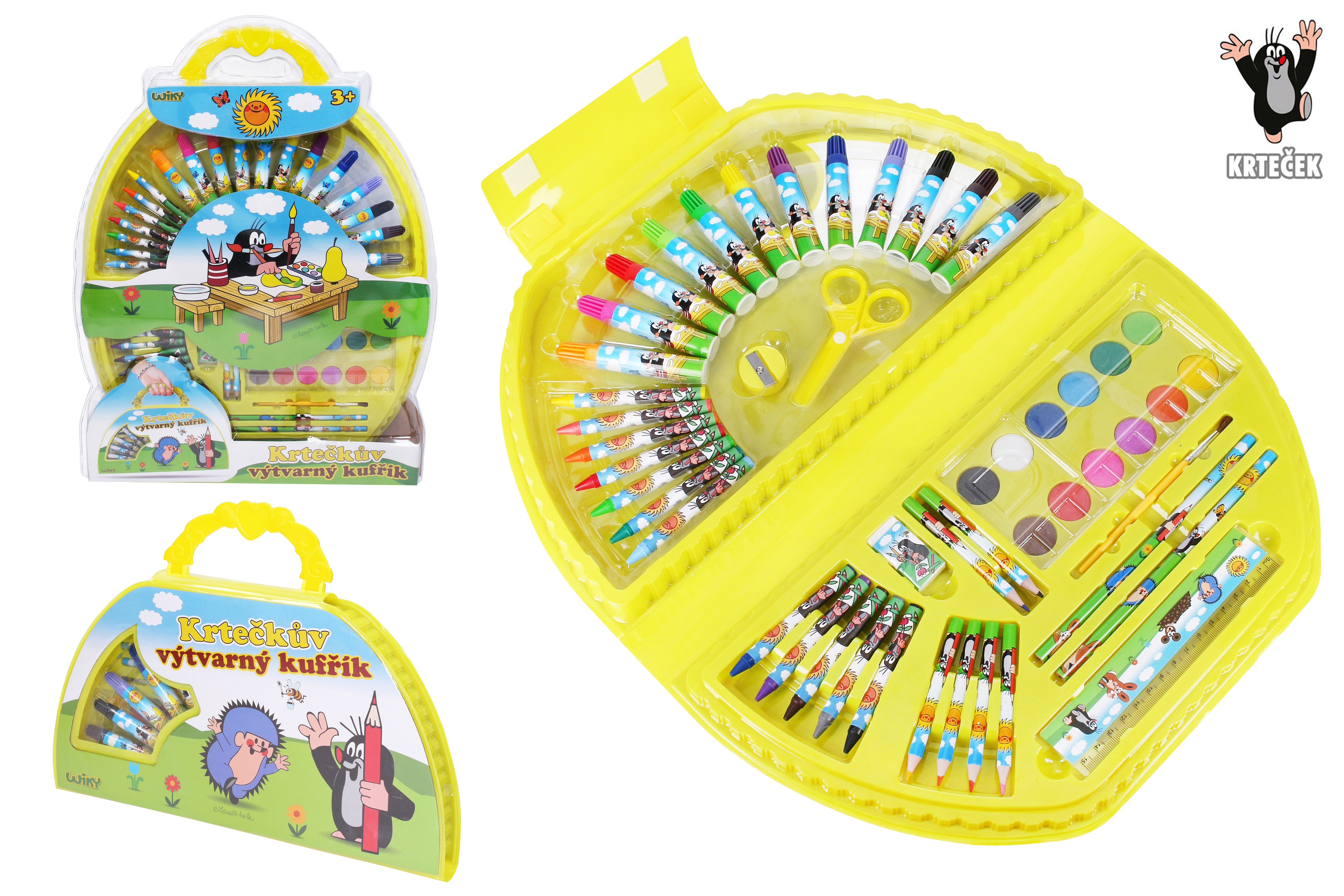 Kufřík výtvarných potřeb 50 ks Krteček je ideální volba pro všechny děti, které rády tvoří a malují. S tímto kompletním výtvarným setem už nikdy nebude chybět žádný důležitý nástroj pro rozvoj jejich kreativity.