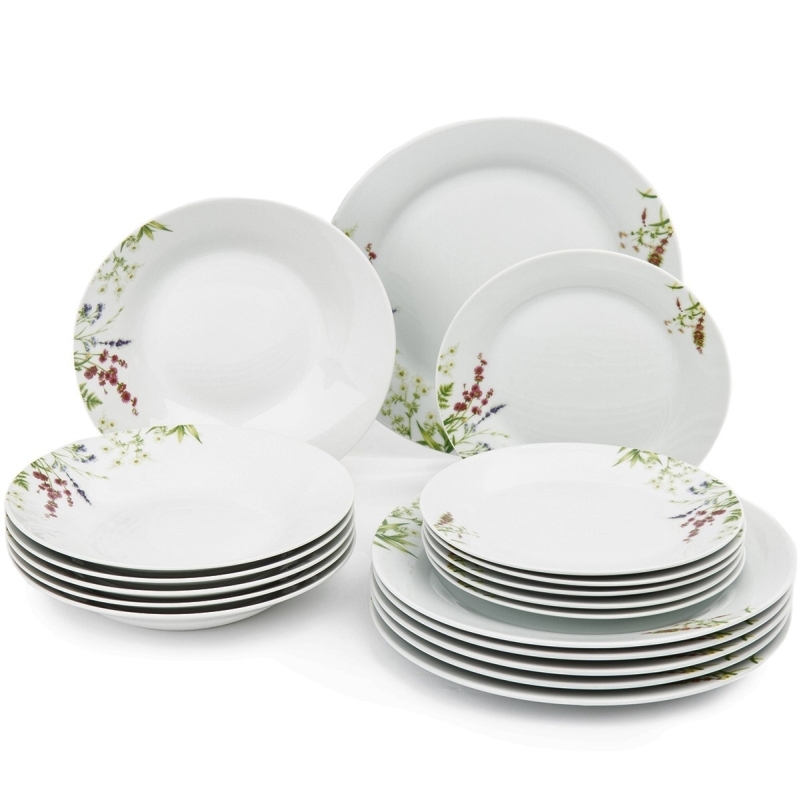 Bílá porcelánová 18 dílná jídelní sada s dekorem lučních květin a bylinek. Sada obsahuje - 6x hluboký talíř, 6x mělký talíř, 6x desertní talíř. Jídelní sada se bude skvěle vyjímat při stolování v klasických, moderních i romantických interiérech. Nádobí je vhodné jak do myčky nádobí, tak pro použití v mikrovlnné troubě. Materiál - porcelán. Rozměry - mělký talíř průměr 27 cm, hluboký talíř průměr 23 cm, desertní talíř průměr 20 cm.