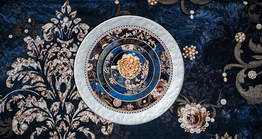 z názvu, který připomíná nejslavnější valčík na světě, Danubio Blu je kolekce výrazné elegance a královské rodiny ozdobená rozšířenými dekoracemi vyjádřenými v květinách a upřímných perlách. Půvabná a elegantní kolekce nese zářivé modré barvy s pohádkovým nádechem, který se dobře přizpůsobí vašemu stolu a vašemu obytnému prostor