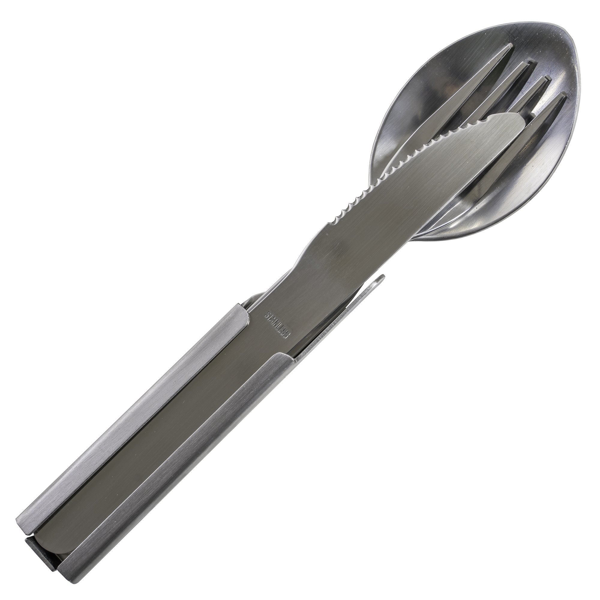 Set obsahuje lžíci, vidličku, nůž a otvírák vhodný jak na konzervy, tak i na lahve. Díky svému praktickému designu a rozměru 19,8 cm je ideální pro kempování, výlety, do práce nebo na cesty. Celý příbor je vyroben z odolné nerezové oceli, která zajišťuje dlouhou životnost a snadnou údržbu. Přestože obsahuje hned čtyři kusy náčiní, váží jen 140 gramů, takže vás nebude nijak zbytečně zatěžovat.