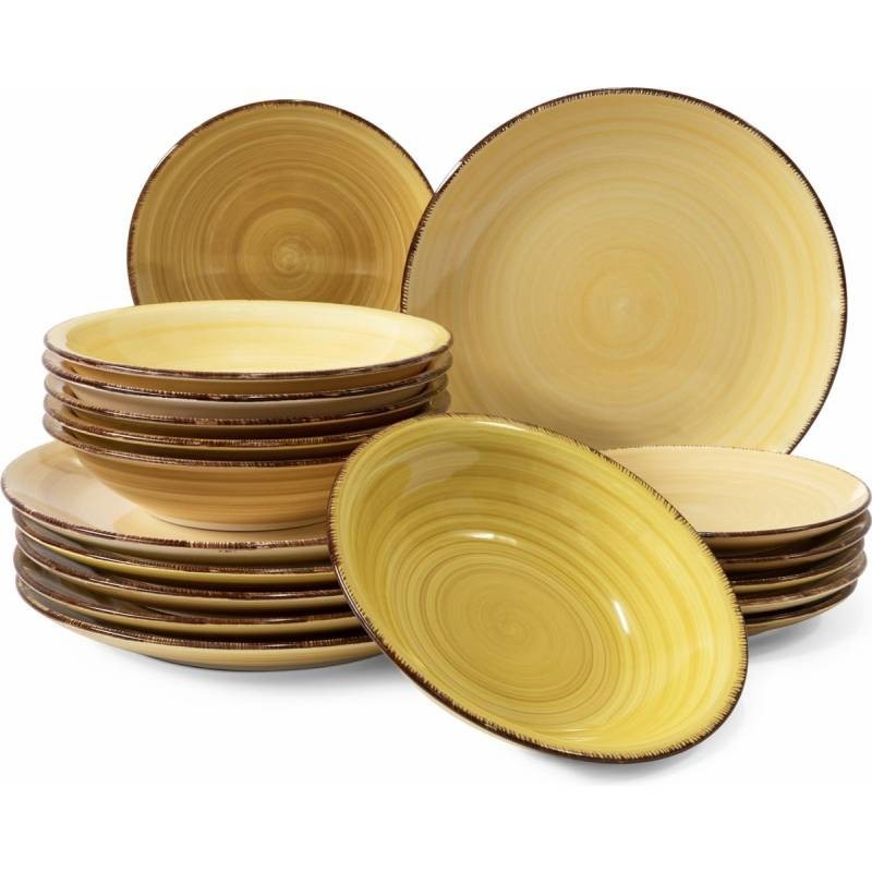 S našimi trendy sadami nádobí můžete přinést radost na stůl i do kuchyně. Naše barevné nebo elegantní jídelní soupravy jsou glazované ve vysoké kvalitě a snadno se s nimi manipuluje. Tato sada obsahuje nejžádanější velikosti talířů, abyste měli ten správný talíř pro každé kulinářské přání.