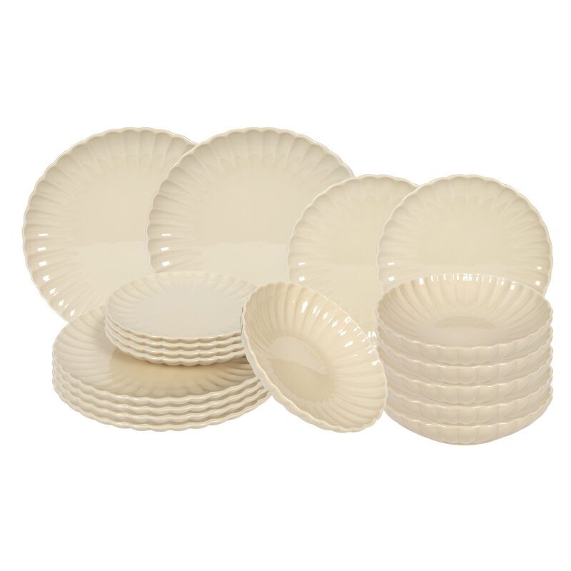 18ti dílná keramická sada s okraji ve tvaru okvětních plátků.