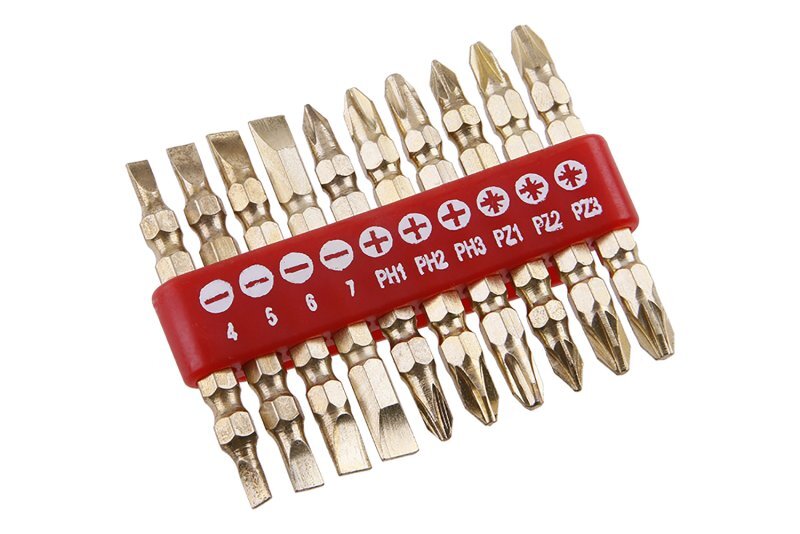 Sada 10 ks oboustranných bitů z chrovanadiové oceli v plastovém organizéru( - 4,5,6,7 + PH1,PH2,PH3, x PZ1,PZ2,PZ3). číst celé