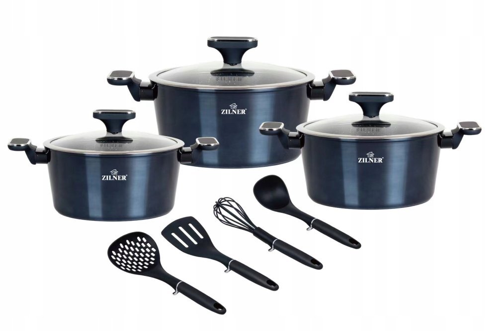 10dílná sada hrnců ZILNER ZL-8594 s mramorovo-keramickým nepřilnavým povrchem je ideální pro každou kuchyni. Hrnce jsou vyrobeny z kvalitního hliníku a mají feromagnetické dno, díky čemuž jsou kompatibilní se všemi typy sporáků - indukčními, plynovými, halogenovými a keramickými. Sada obsahuje 3 hrnce s poklicemi (20 cm, 24 cm, 28 cm) a 4 kusy kuchyňského náčiní. Skleněné poklice s moderními úchyty umožňují pohodlnou kontrolu vaření bez nutnosti jejich zvedání. Hrnce jsou odolné vůči vysokým teplotám a umožňují rychlé a rovnoměrné rozložení tepla, což zajišťuje efektivní vaření.