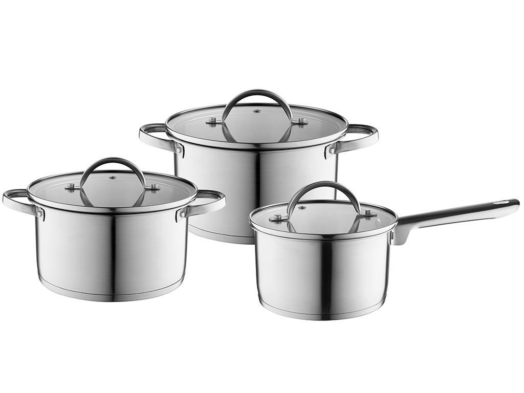 Sada obsahuje: 2 hrnce (18 cm / 2,5 l, 20 cm / 3,1 l), 1 rendlík (16 cm / 1,7 l)Materiál: nerezová ocel 18/0 (201 s/s)Tloušťka stěny: 0,5mm3vrstvé dno, energeticky úsporné - hrnec se rychle zahřeje a dlouho udržuje správnou teplotuNýtované rukojeti z nerezové oceliSpeciálně profilovaný okraj usnadňuje nalévání bez rozstřikováníSkleněná poklička z tvrzeného sklaOtvor pro odvod páry v pokličceMěrka uvnitř hrncůVhodné na všechny typy sporáků včetně indukceTvar: rovnýZvenku lesk, uvnitř saténový povrch