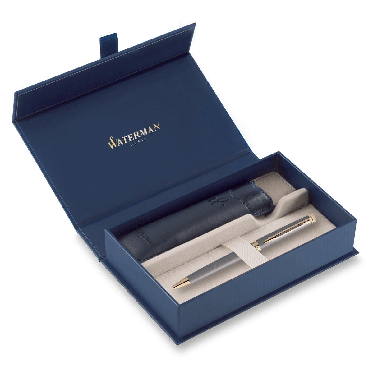 Dárková kazeta s kuličkovým perem Waterman Hémisphère Stone Grey GT s šedě lakovaným nerezovým tělem. V kombinaci s doplňky pokovenými zlatem.