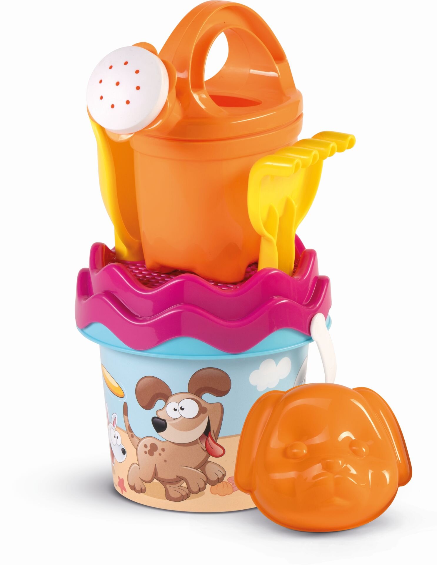 6dílná sada na písek, vyrobená z kvalitních plastů v Itálii. Obsahuje: Kyblík, konvičku 0,5 l, sítko, lopatku, hrabičky a tvořítko ve tvaru psí hlavy. Kyblík: průměr 13 cm, výška 11 cm. Sada: výška 29 cm, váha 0,251 kg. Doporučený věk od 10 měsíců. číst celé