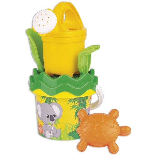 6dílná sada na písek, vyrobená z kvalitních plastů v Itálii. Obsahuje: Kyblík, konvičku 0,5 l, sítko, lopatku, hrabičky a tvořítko ve tvaru želvičky. Kyblík: průměr 13 cm, výška 11 cm. Sada: výška 29 cm, váha 0,35 kg. Doporučený věk od 12 měsíců. Výrobce, italská firma Androni Giocattoli sídlící nedaleko Milána, se specializuje na výrobu plastových hraček na písek a zahradu a také stavebnic UNICO Plus již od roku 1974. Jejím mottem je heslo: Androni Toys: Kvalita vyrobená v Itálii. Používané plasty jsou pevné, ale zároveň pružné a při běžném hraní nedochází k jejich praskání. Vydrží i větší zátěž a proto jsou výrobky vhodné i do školek, kde téměř denně procházejí zatěžkávací zkouškou.