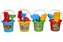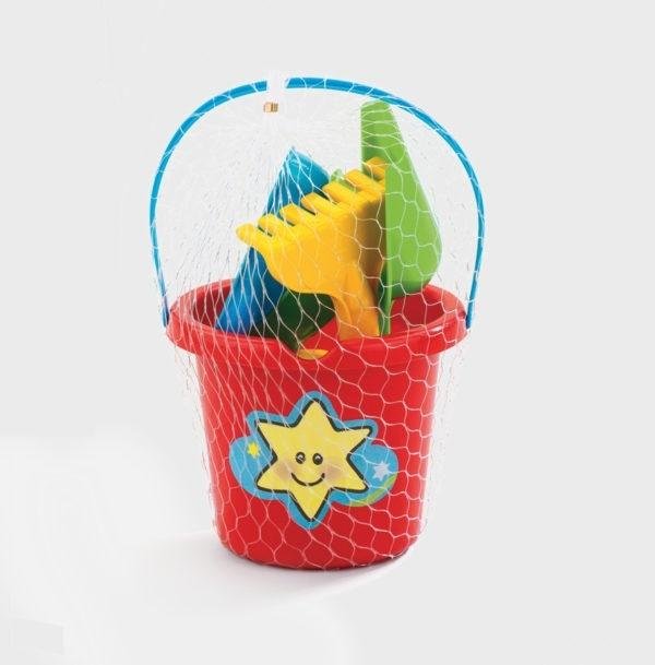 Komplet zawiera: wiaderko, łopatkę, grabki oraz 3 foremki. Mix kolorów, towar wysyłany losowo.