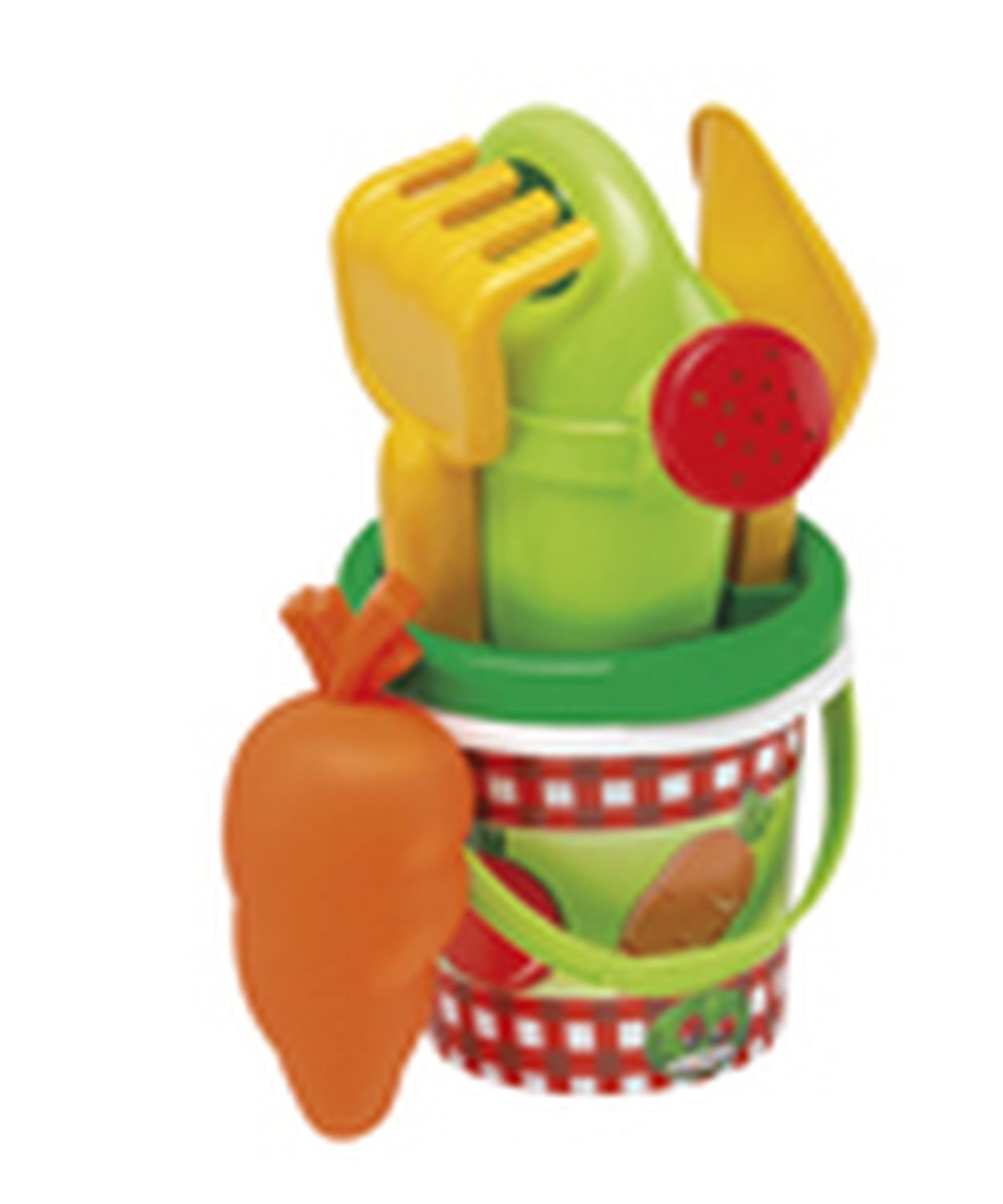 Kyblíček s obrázky zeleniny. Součástí konvička, sítko, lopatička, hrabičky a formička ve tvaru mrkve. Průměr kyblíčku 12 cm. Vše plastové. Vyrobeno ve Francii.