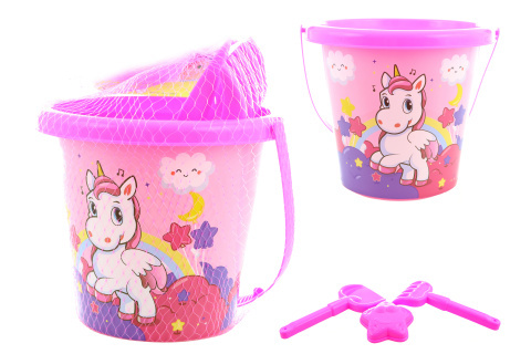 Sada na písek obsahuje kyblík, hrabičky, lopatku a formičku ve tvaru hvězdičky. Baleno v síťce. Rozměry kyblíku cca 13x15 cm. Věk 3+ číst celé