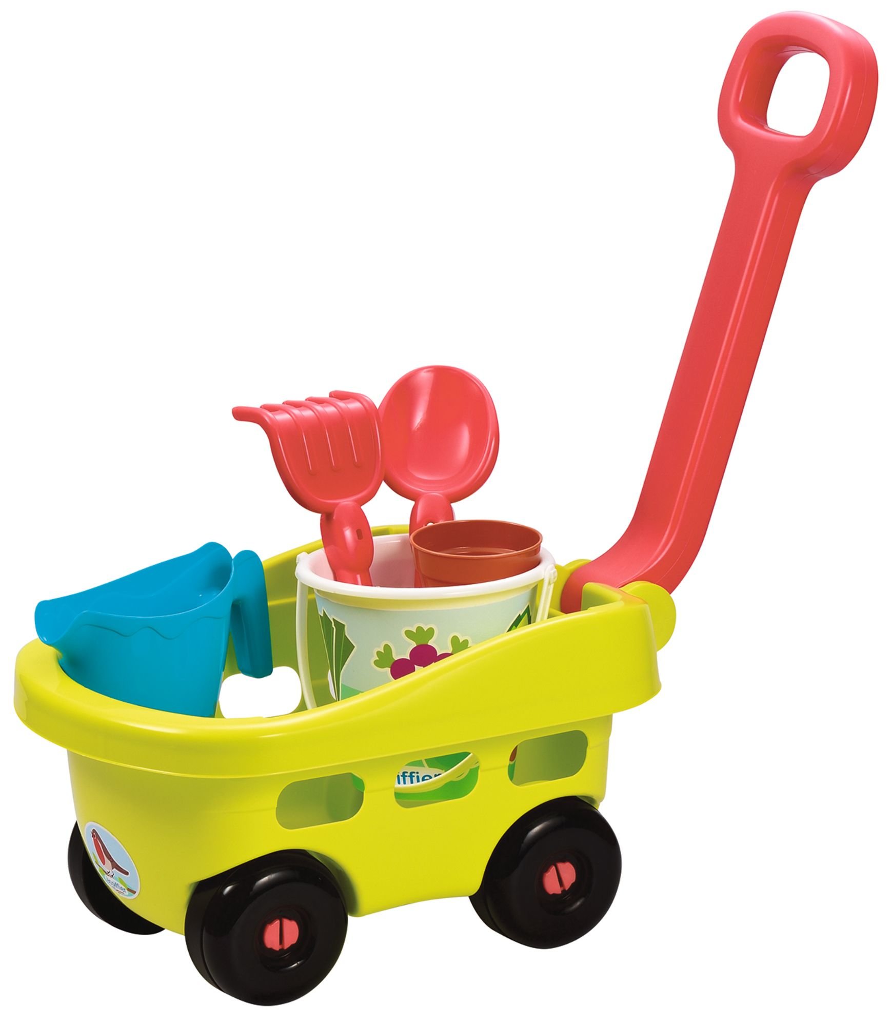 Zahradní vozík s kyblíčkem, květináčem, konvičkou, lopatičkou a hrabičkami. Rozměry vozíku: 40 x 21 x 27 cm. Hmotnost: 0,75 kg. číst celé
