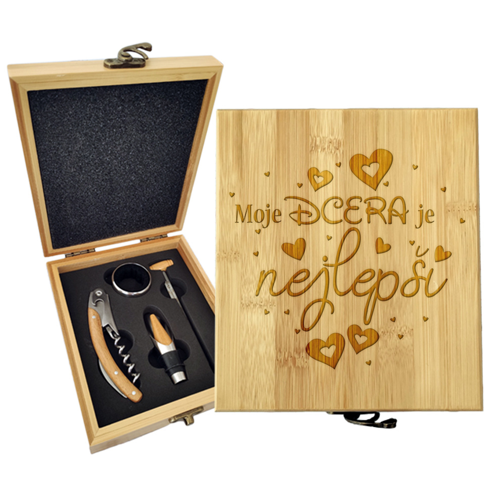 Dárková sada na víno v dřevěné krabičceIdeální dárek pro každého milovníka vína je dřevěná krabička se sadou na víno s originálním gravírovaným věnováním.Sada obsahuje 4 kusy a krabička je vyrobená z bambusu.Rozměry: 147×168×49 mm číst celé