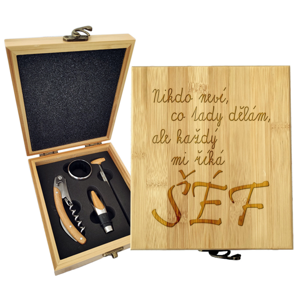 rozměry krabičky: 147x168x49 mm krabička vyrobená z bambusu sada obsahuje: vývrtku, kroužek proti odkapávání, zátku a teploměr originální motiv na krabičce gravírování CO2 laserem