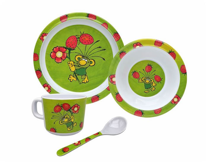 - 4 díly v sadě: talířek (průměr 21 cm), miska (průměr 16 cm), hrneček (výška 6,5 cm), lžička (délka 14 cm)
