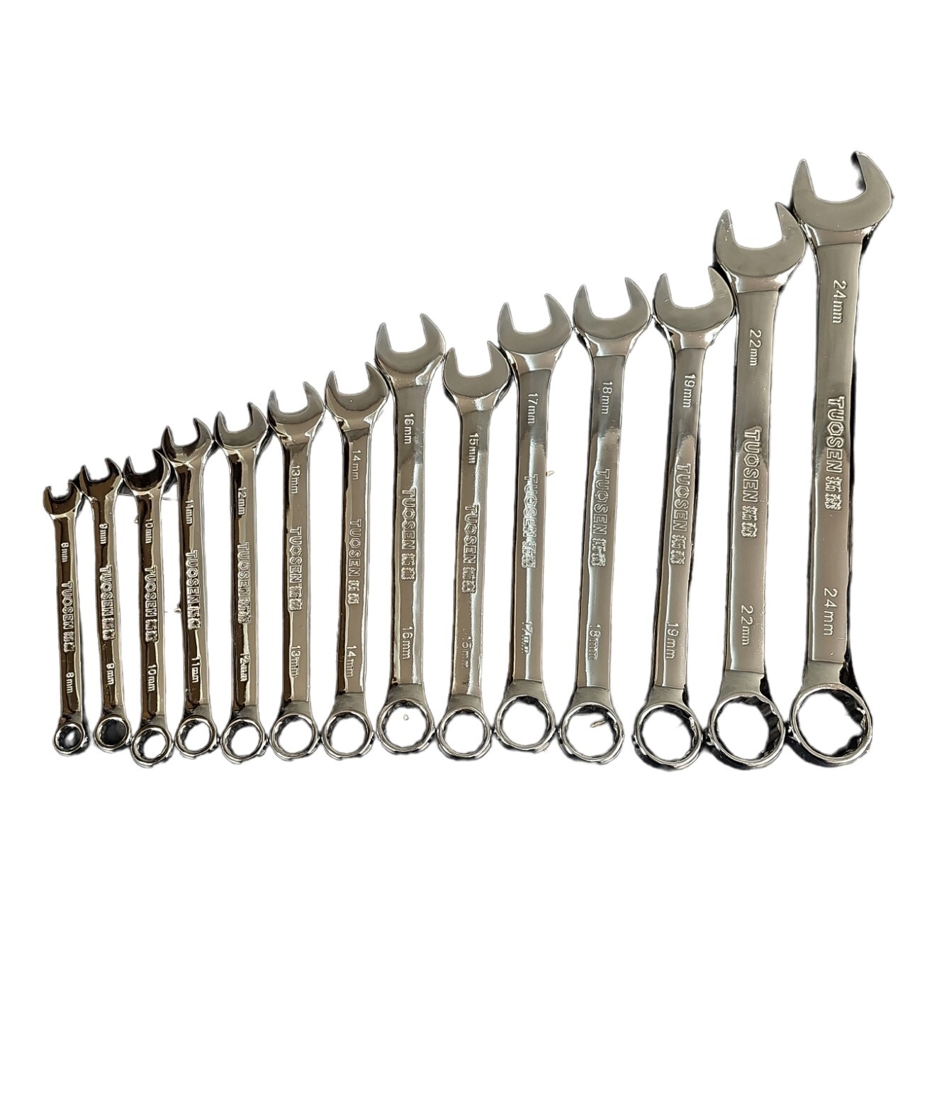 Kombinované ploché klíče a 12-hranné očkové s 15° vyhnutím pro lepší přístup. Zápustkově kováno, z chrom-vanadiové oceli, tvrzené a kalené 43 - 48HRC. Vysoce kvalitní, plně leštěný povrch. Úložný obal z velmi pevného nylonu. Obsahuje velikosti 8, 9, 10, 11, 12, 13, 14, 15, 16, 17, 19, 21, 22 a 24 mm.