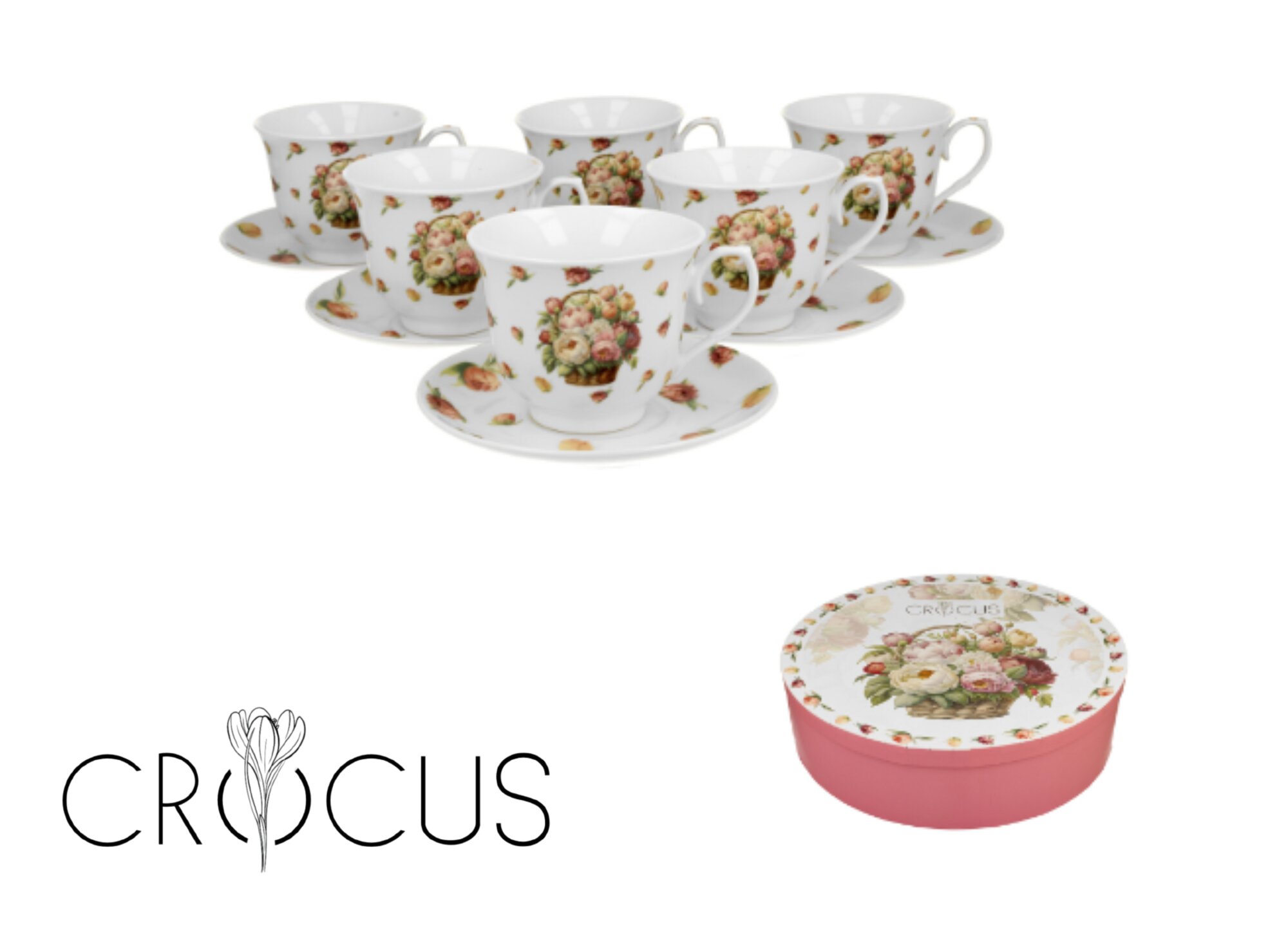 Komplet sześciu filiżanek ze spodkami Kosze Kwiatów PIWONIE wchodzący w skład serii CROCUS, wykonany z porcelany New Bone China, charakteryzującej się elegancką i naturalną kremowo - białą barwą z delikatnym połyskiem, a także wyjątkową wytrzymałością.