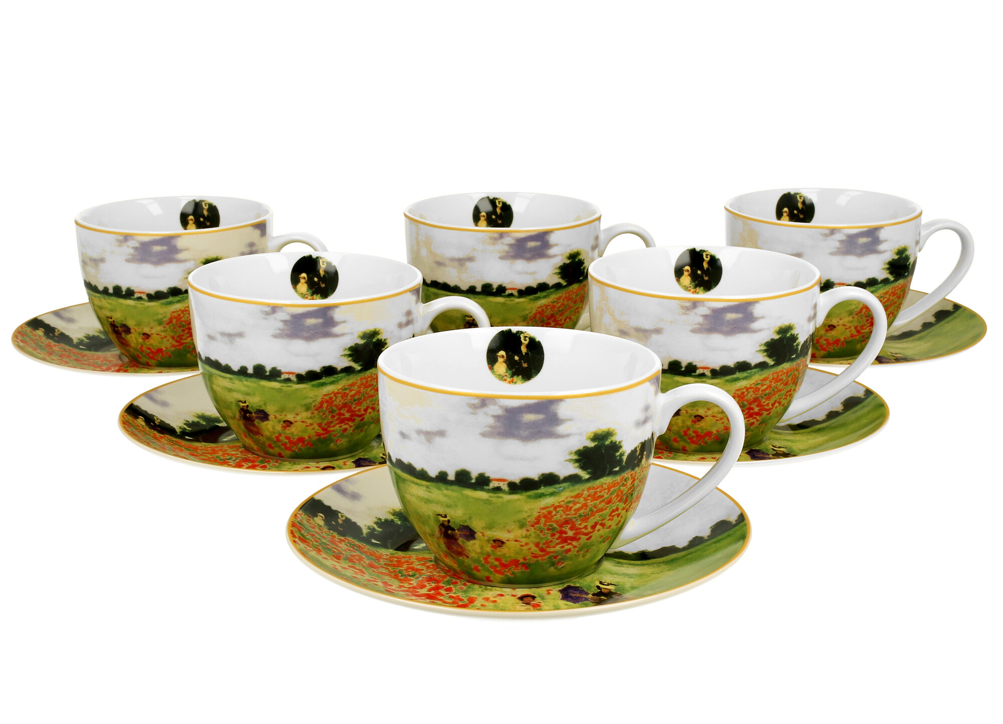 Komplet sześciu filiżanek 250 ml ze spodkami POPPY FIELD C. Monet wchodzące w skład serii Art Gallery, wykonane z porcelany New Bone China, charakteryzującej się elegancką i naturalną kremowo - białą barwą z delikatnym połyskiem a także wyjątkową wytrzymałością przy zachowaniu lekkości i delikatności.