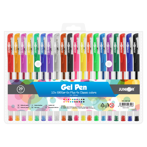 Tato sada 20 gelových per obsahuje pestrý mix stylů - glitter, fluo i klasické barvy - takže si snadno vyberete pero přesně podle nálady i potřeby. Transparentní tělo pera umožňuje jednoduchou kontrolu stavu náplně, a tím i lepší přehled o zásobách. Perfektní sada pro školu, kancelář nebo kreativní projekty.