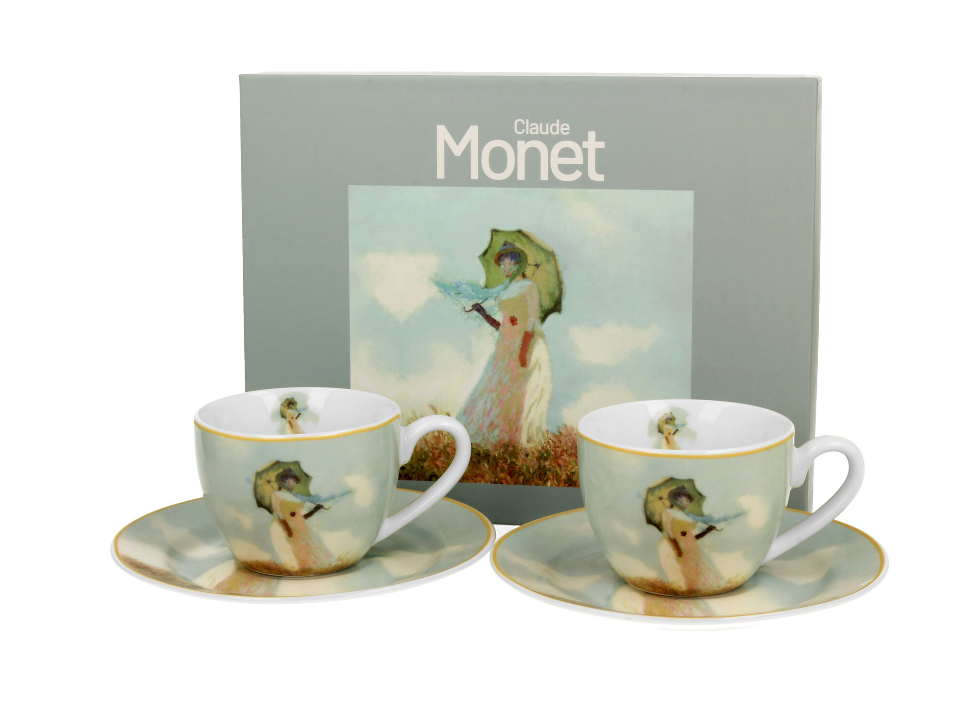 Dwie filiżanki espresso ze spodkami WOMAN WITH PARASOL inspired by C. Monet wchodzące w skład serii Art Gallery, wykonane z porcelany New Bone China, charakteryzującej się elegancką i naturalną kremowo - białą barwą z delikatnym połyskiem a także wyjątkową wytrzymałością przy zachowaniu lekkości i delikatności.