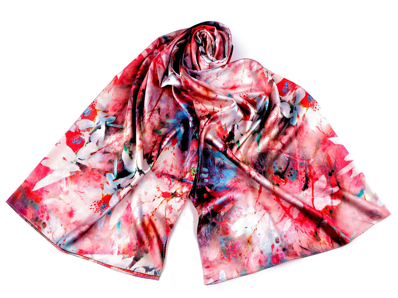 Luxusní saténová šála je zcela unikátní, protože má na přední i zadní straně úplně odlišný vzor. Na jedné straně jsou například květy růží a na zadní mohou být listy v podzimní barvách. Mimoto je lehounká a měkká, na dotek připomíná hedvábí. Využijete ji do společnosti i na všední nošení ke kabátu, saku, halence, svetříku, šatům apod.