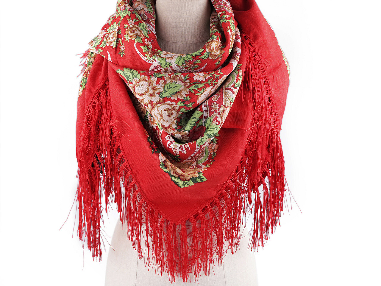 Šátek folklór květy s třásněmi 105x105 cm - 1 ks - 3 červená