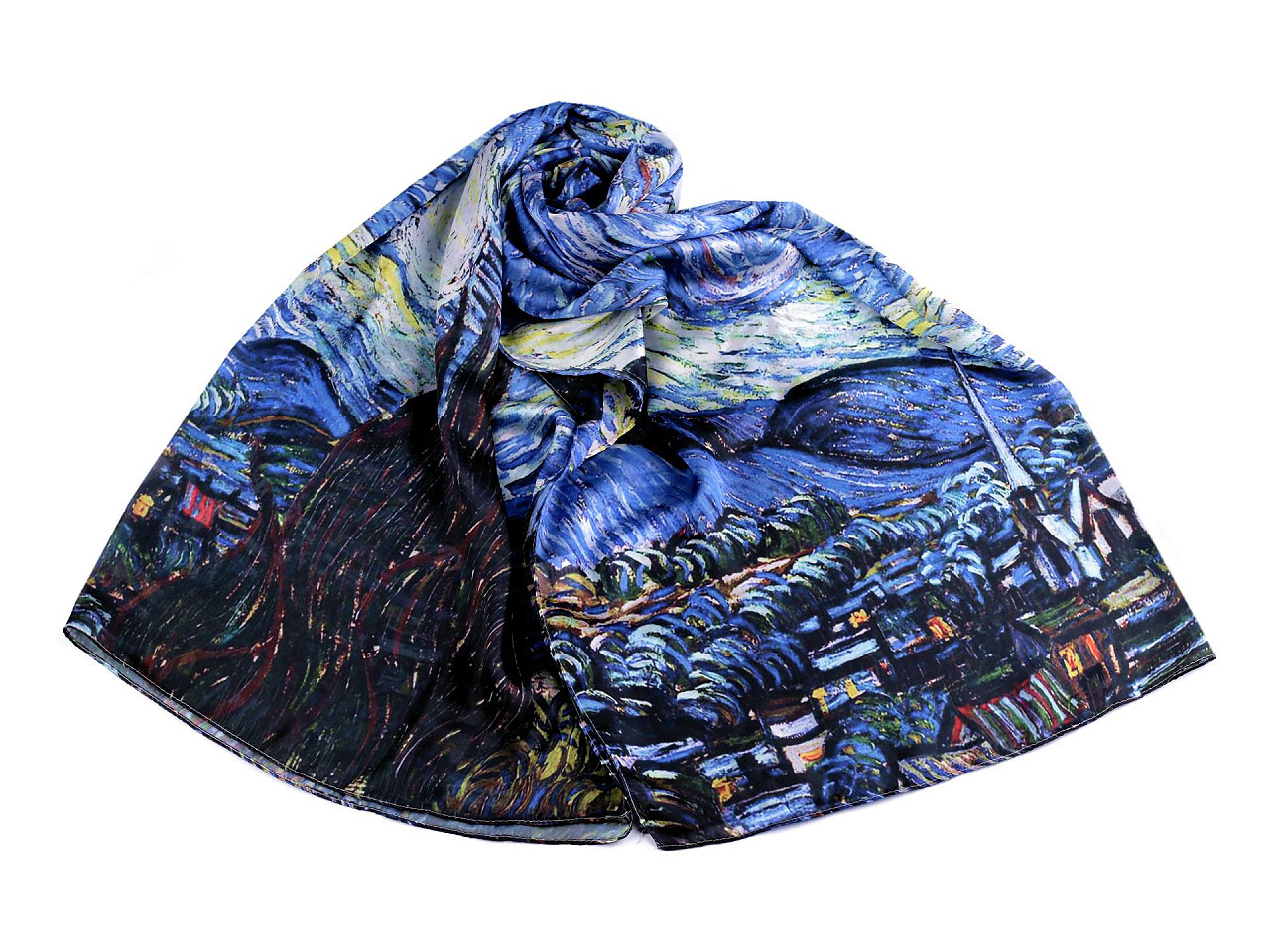 Jemná vzorovaná šála je lehounká a měkká, vyrobená z příjemného, chladivého materiálu. Její vzor je inspirovaný malbou slavných obrazů. Využijete ji do společnosti i na všední nošení ke kabátu, saku, halence, svetříku, šatům apod.