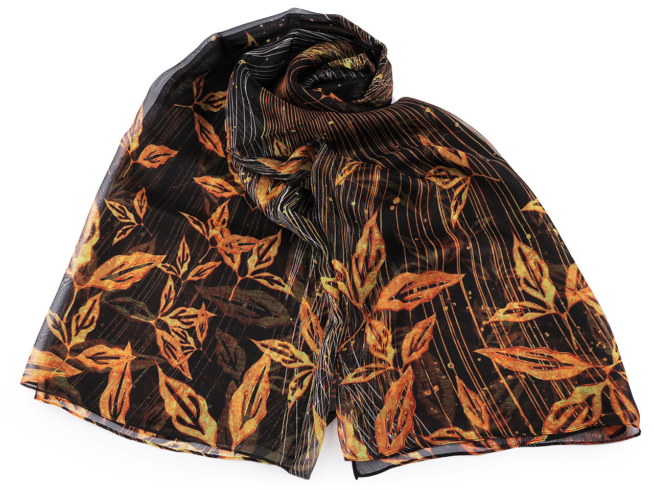 Široká šála se vzorem listů a abstraktních čar je lehounká a měkká, vyrobená z příjemného materiálu. Využijete ji do společnosti i na všední nošení ke kabátu, saku, halence, svetříku, šatům apod. Je poloprůsvitná, oboustranná, dá se nosit i v letních večerech nebo jako průsvitné pareo na plavky.