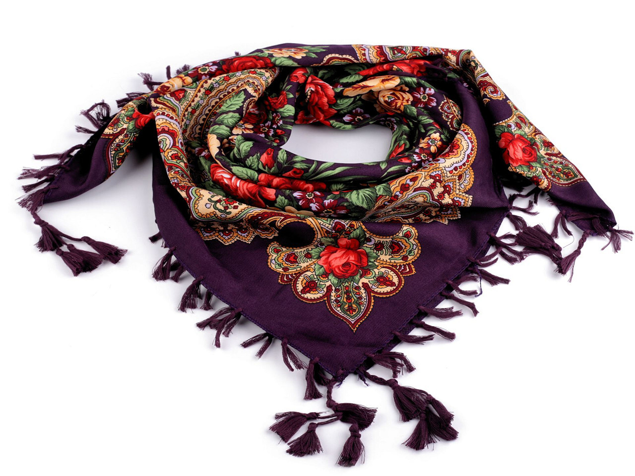 Šátek folklór květy růží s třásněmi 90x90 cm - 1 ks - 6 fialová tmavá