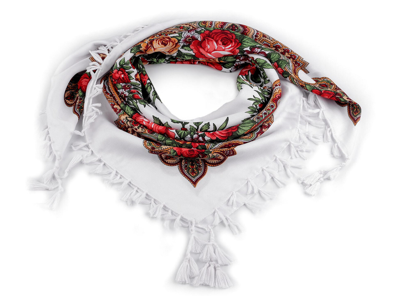 Šátek folklór květy růží s třásněmi 90x90 cm - 1 ks - 1 bílá