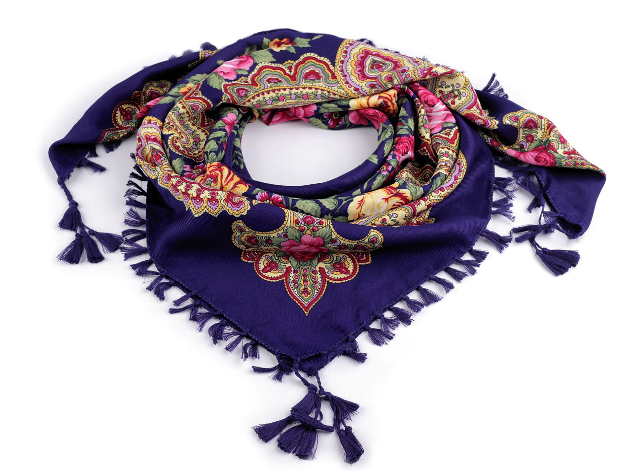 Šátek folklór květy růží s třásněmi 90x90 cm - 1 ks - 5 modrá kobaltová