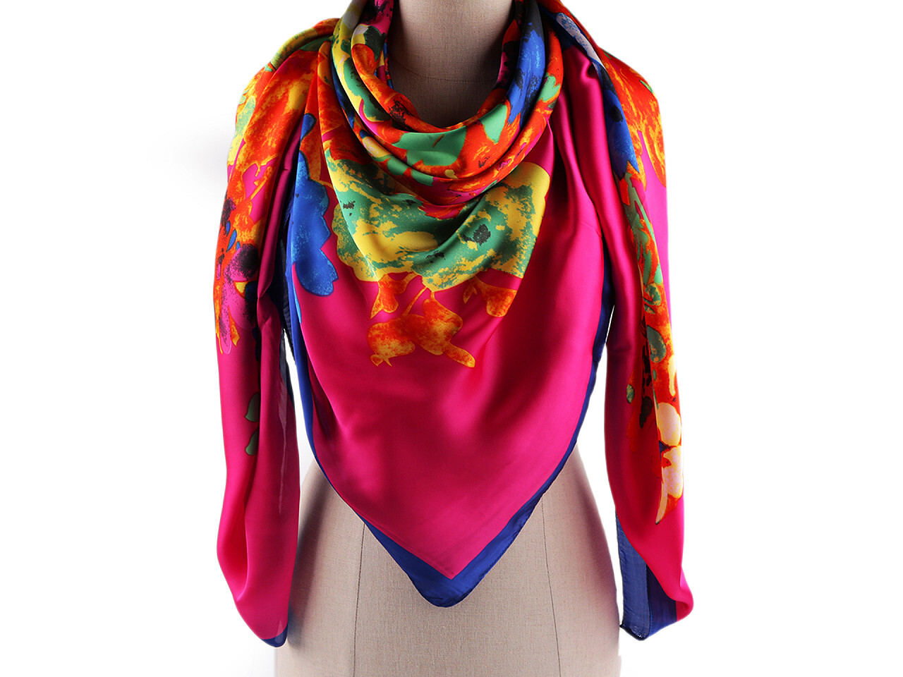 Elegantní saténový šátek s motivem velkých barevných květů. Příjemný materiál s jemným leskem vás bude doslova hýčkat. Šátek potěší všechny ženy, které mají rády estetické doplňky. Hodí se do společnosti i do práce ke kostýmku, kabátu, halence, svetříku apod. Můžete jej variabilně upravit kolem krku. Šátek je dostatečně velký, aby posloužil i jako pareo na pláž.
