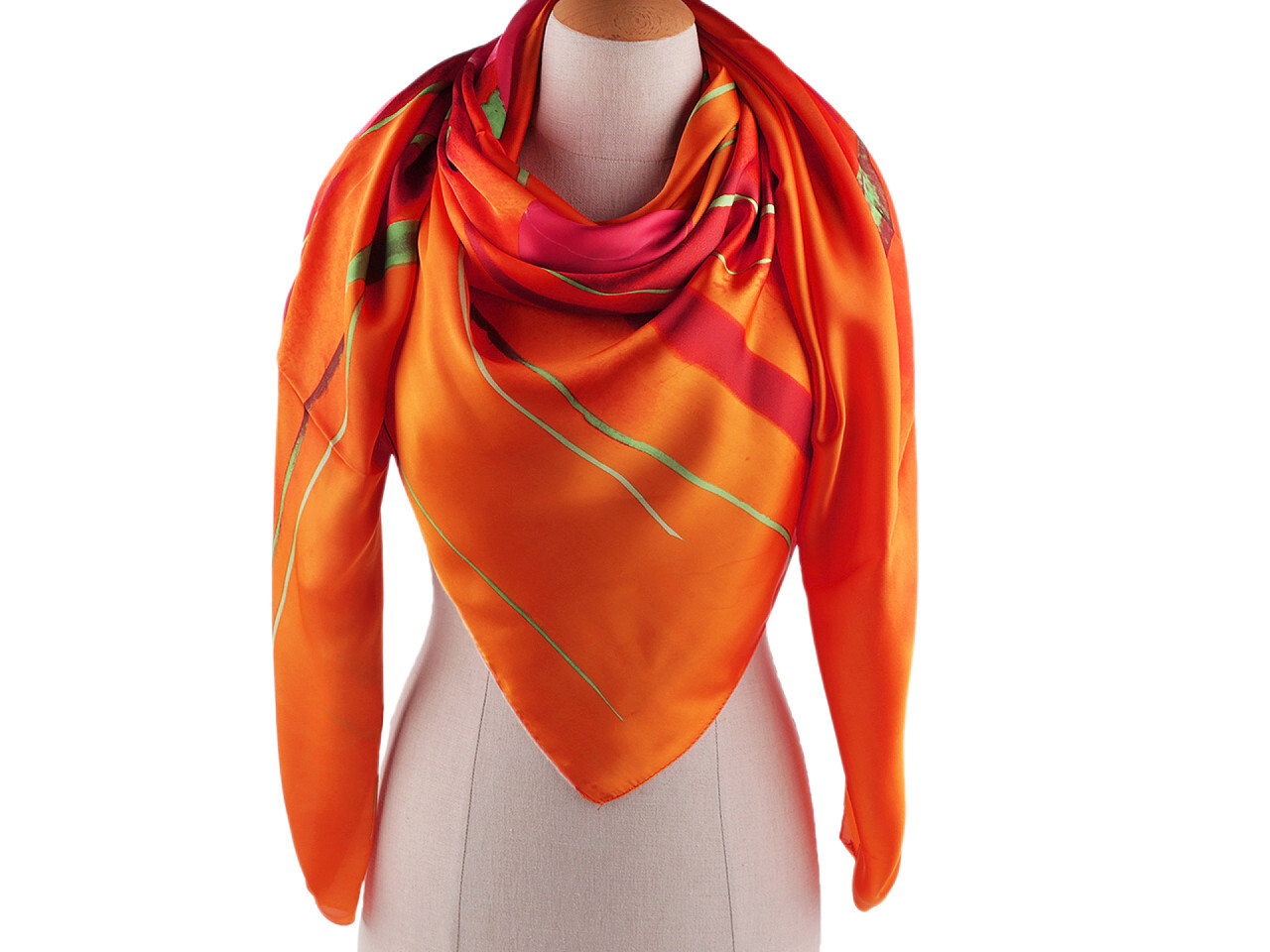 Velký saténový šátek s květy 130x135 cm - 1 ks - 25 oranžová