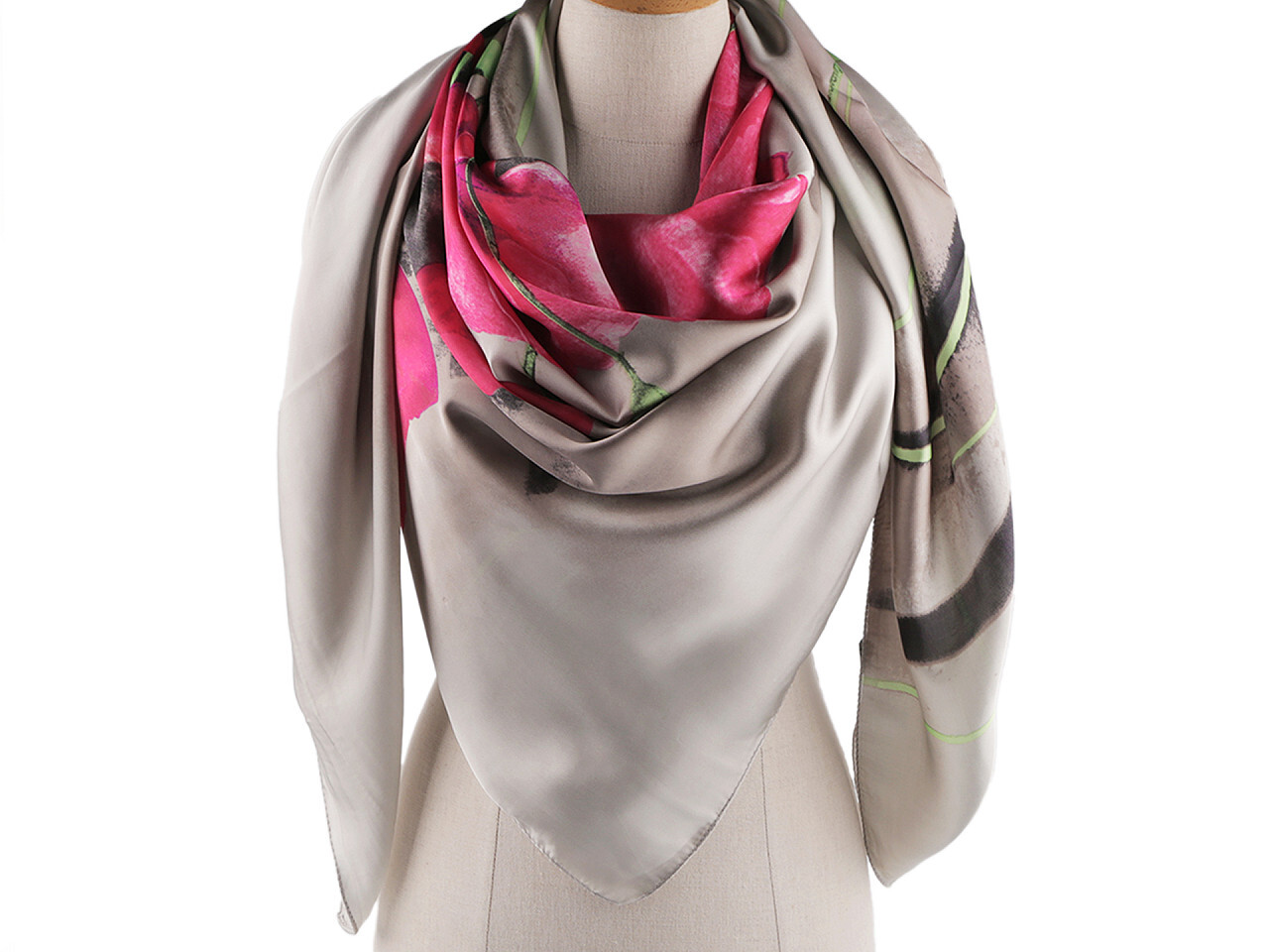 Velký saténový šátek s květy 130x135 cm - 1 ks - 26 šedá světlá